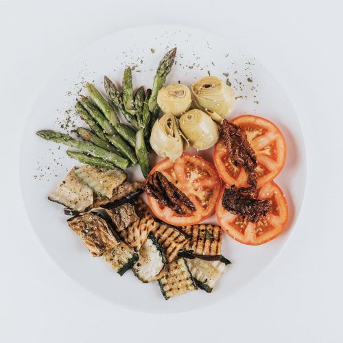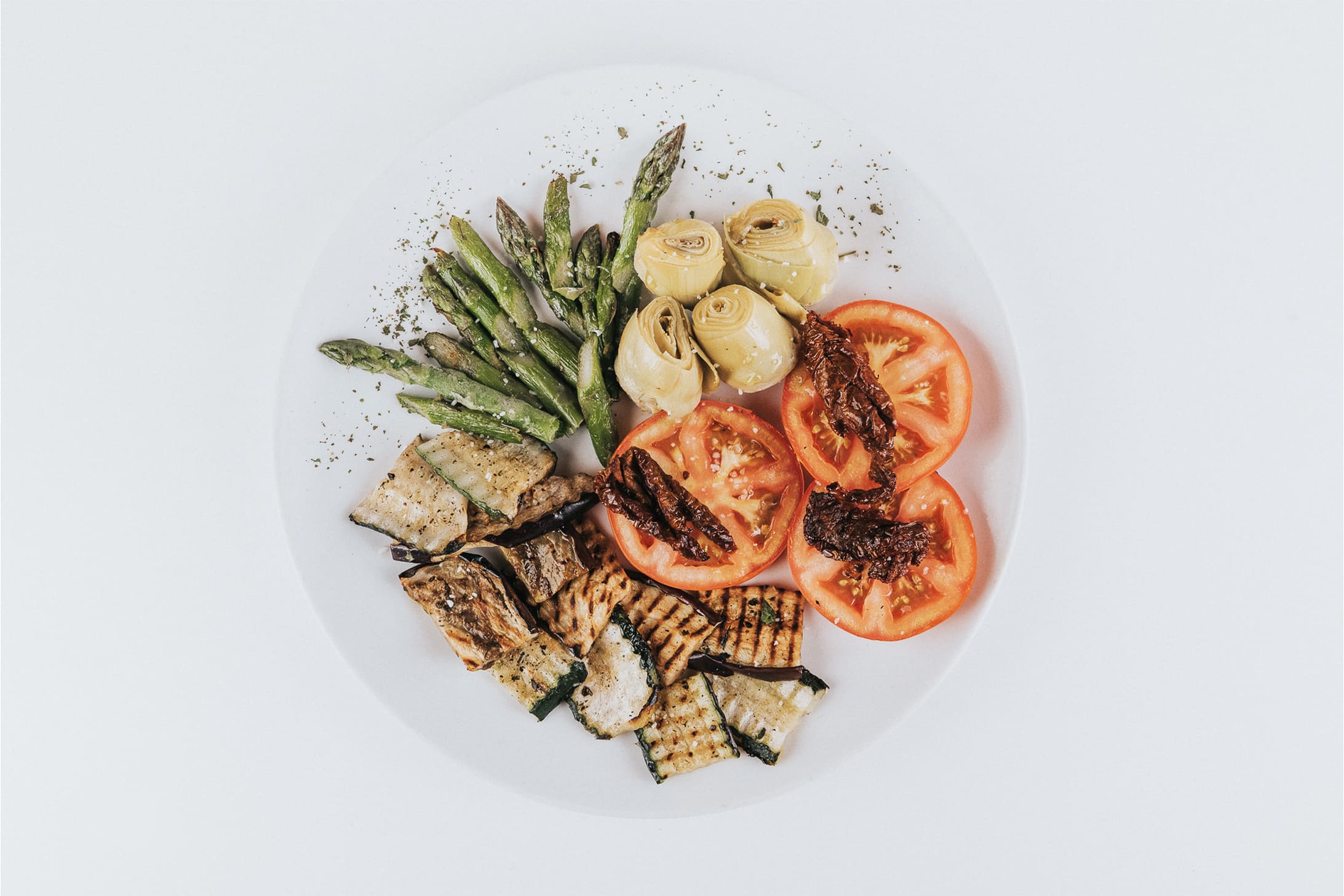Verduras frescas a la parrilla: berenjena, calabacín, pimiento rojo, alcachofa, tomate fresco y seco, espárragos trigueros y un toque de pesto verde