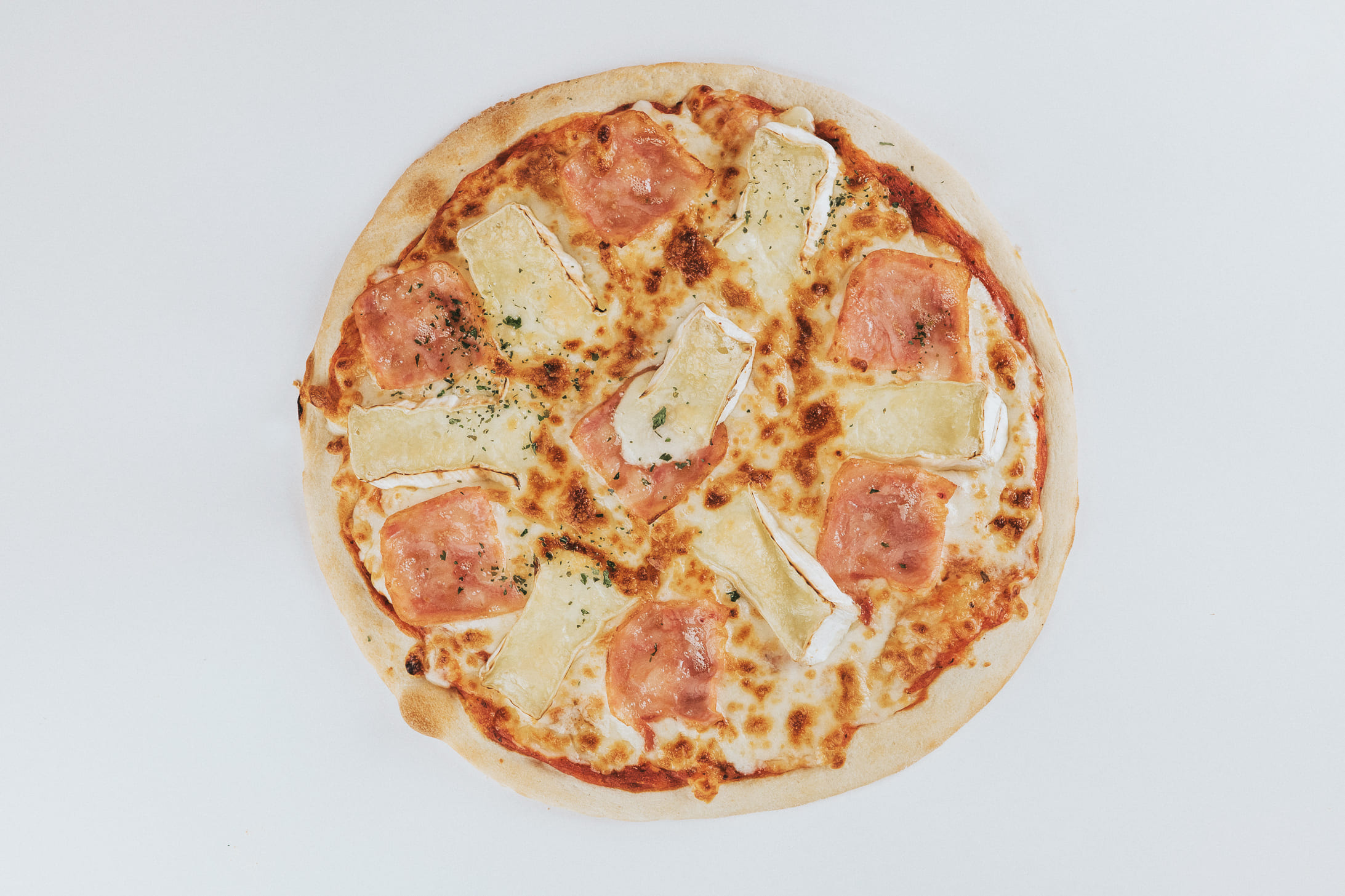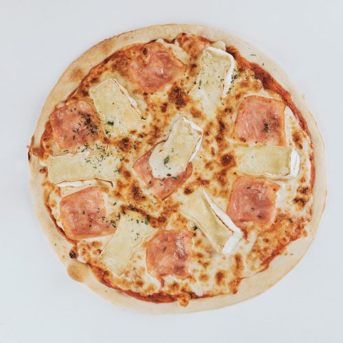 Salsa de tomate, mozzarella, láminas de queso camembert y bacon