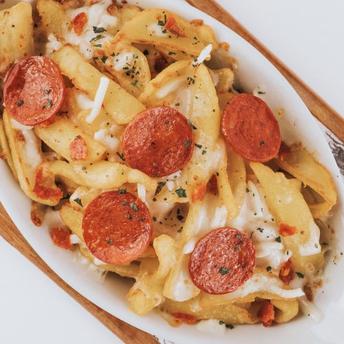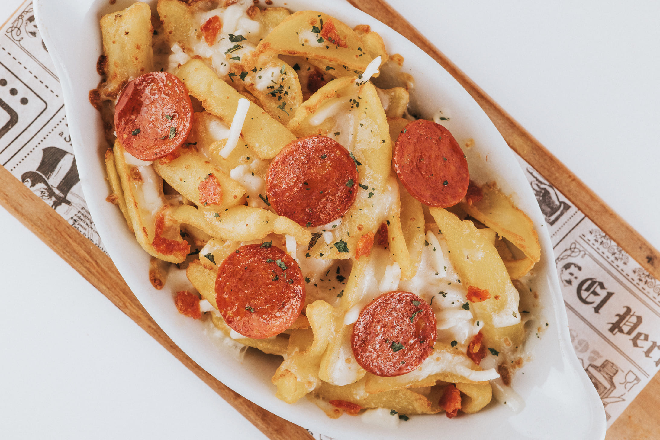 Jugosas patatas dipper con pepperoni y mozarella gratinadas al horno