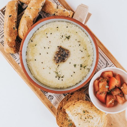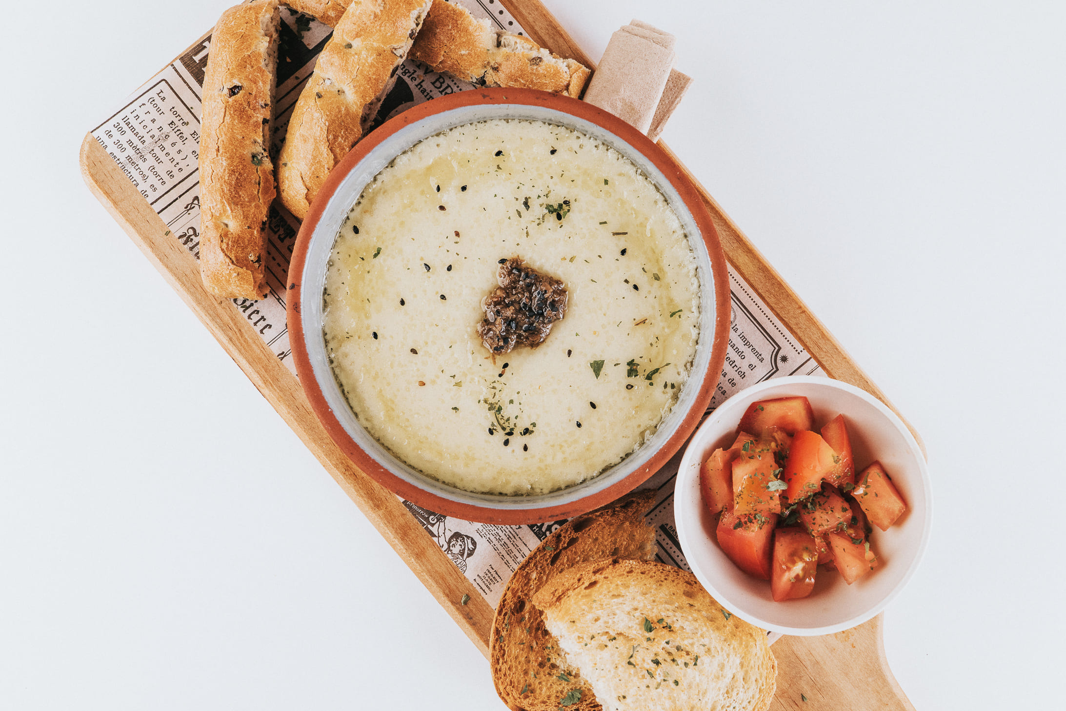 Queso provolone fundido con pasta de trufa acompañado de pan crostini y focaccia romana