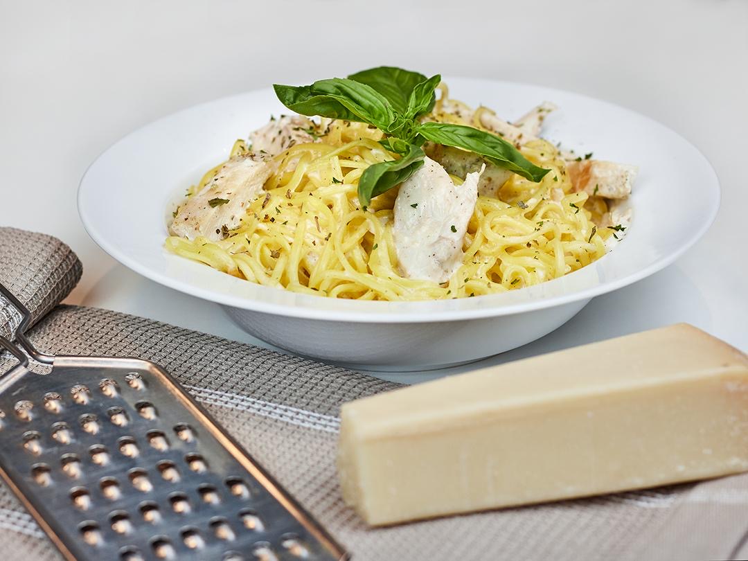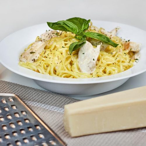 con pechuga de pollo, crema de queso parmesano, nuez moscada y un toque de pimienta blanca