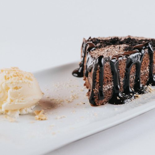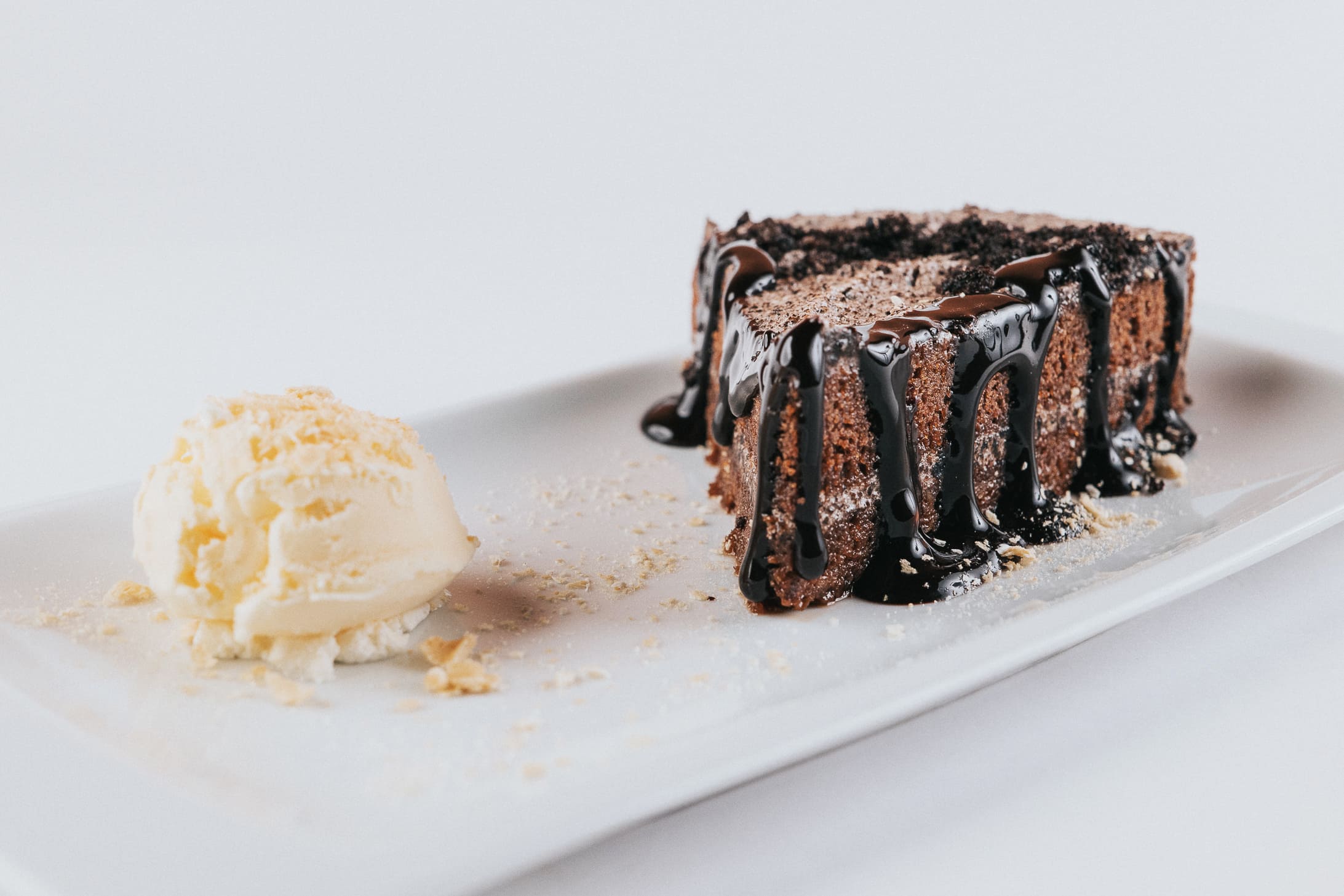 Tarta con bizcocho de chocolate y crema de galletas Oreo, acompañada con helado de nata y salsa de chocolate