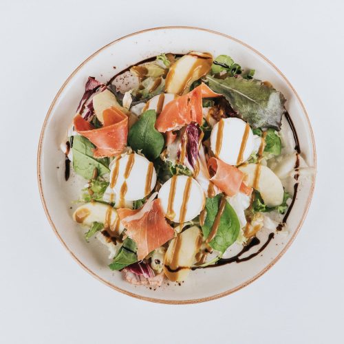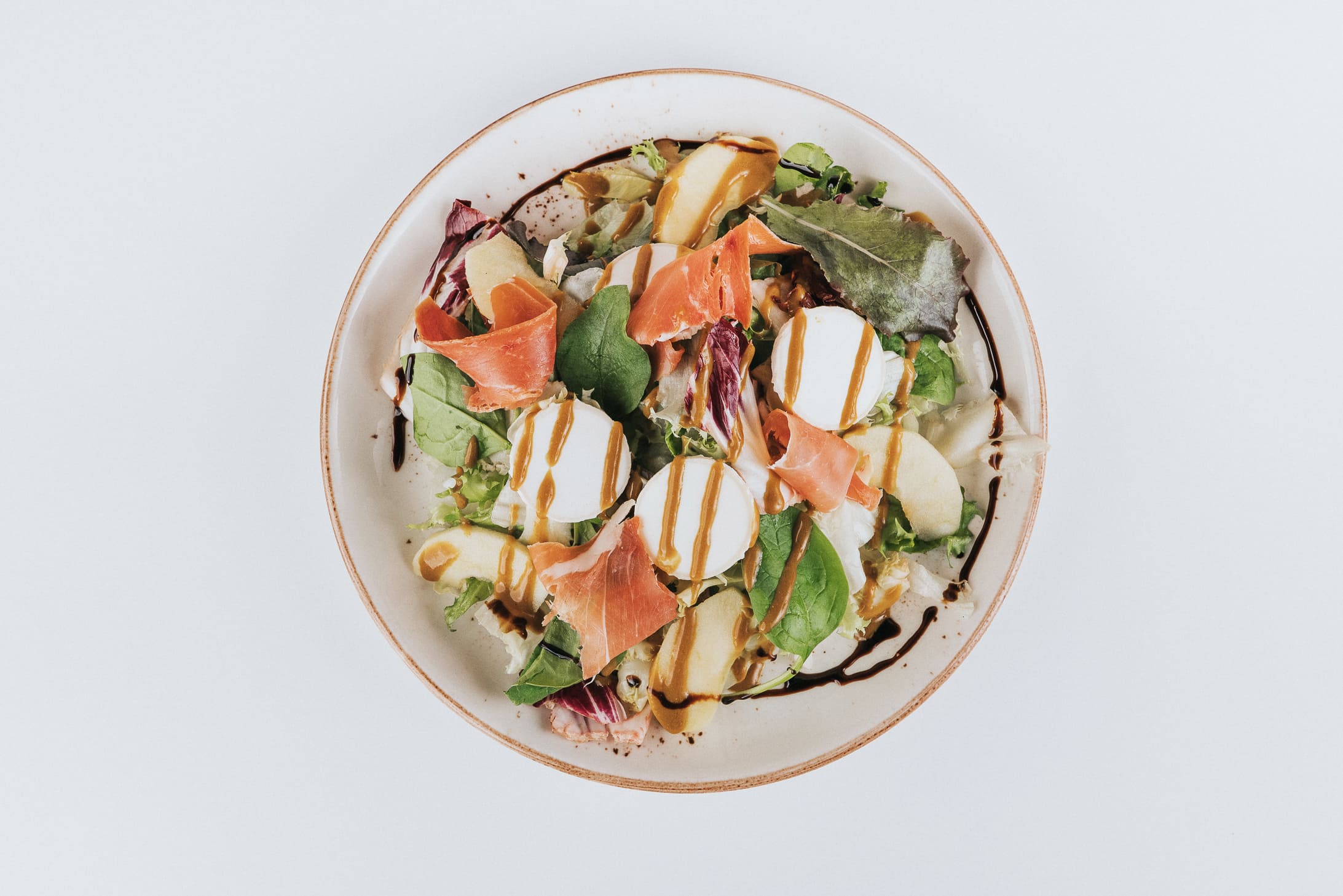 Base de lechugas variadas, paleta ibérica, queso de cabra y manzana, con salsa de mostaza y vinagreta balsámica